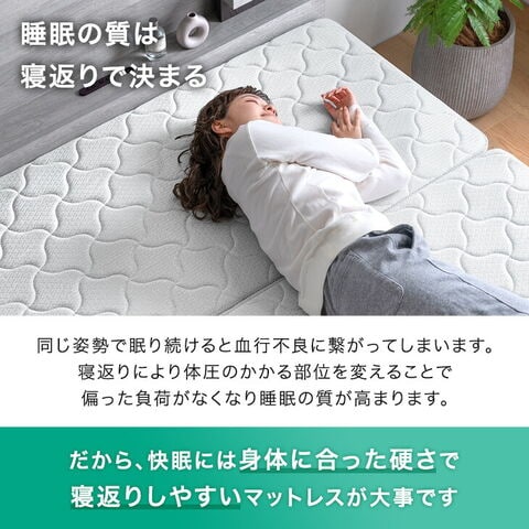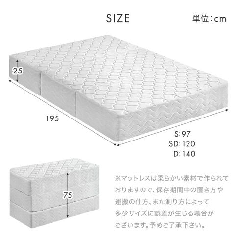 【シングル】幅97×奥行195×高さ25cm 【セミダブル】幅120×奥行195×高さ25cm 【ダブル】幅140×奥行195×高さ25cm ※マットレスは柔らかい素材で作られておりますので、保存期間中の置き方や運搬の仕方、また測り方によって多少サイズに誤差が生じる場合がございます。予めご了承下さい。 |