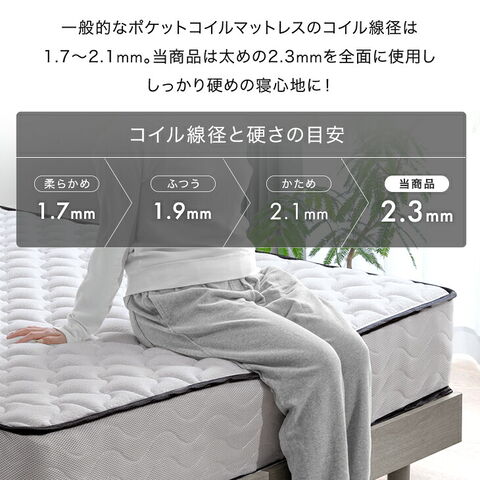 ・身体をガッチリ支えるスーパーハード 線径2.3mmポケットコイル ┗体格の良い方や男性におすすめ ・硬いだけじゃない!寝心地にこだわった多層構造 ┗贅沢な寝心地を生む極厚25cm ┗もっちり身体を包み込むウレタンフォーム ┗身体を点で支え、体圧分散性に優れたポケットコイル ・気になるニオイを消臭!ウレタンに竹炭成分を配合 ・柔らかな肌触りのニット生地 ・側面は通気性の良いメッシュ生地 ・生地は世界基準の安全性 エコテックス認証 ・ISO9001認定工場で生産した安心の品質 |