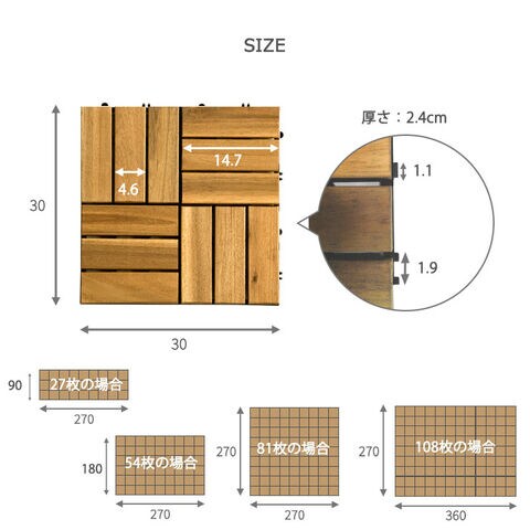 | 27枚セット 【1枚あたりのサイズ】 外寸:約30×30cm(厚さ約2.4cm) ウッド部分:約29.7×29.7cm(厚さ約1.15cm) |