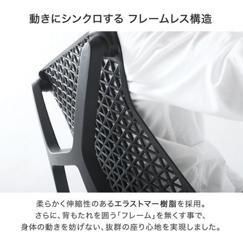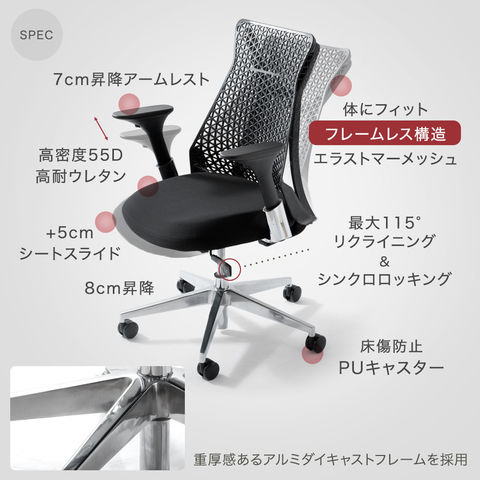 | ・感性を刺激するジオメトリックデザイン ・体の動きに柔軟にフィットするフレームレス構造 ・心地よい揺れを生み出すシンクロロッキング ・一息つくのに最適な最大115°リクライニング ・使いやすい高さに調整 昇降アームレスト ・身長に応じて座面の奥行きを変えられるシートスライド機能 ・通気性抜群のでムレずに快適 ・デザイン性の高いアルミダイキャストフレーム ・高密度55Dの高耐久モールドウレタン座面 |