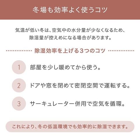 | 詳細 | ■定格電圧:AC100V 50/60Hz ■定格消費電力:155W(50Hz)/200W(60Hz) ■電気代(1時間あたり): 約5.75円(50Hz)/約7.32円(60Hz) ■除湿方式:コンプレッサー式 ■最大除湿量: <環境温度30℃/湿度80%時>10L/日、12L/日 <環境温度27℃/湿度60%時>5.8L/日、6.19L/日 ■対応面積の目安: 50Hz…木造10畳/鉄筋20畳、60Hz…木造12畳/鉄筋24畳 ■動作音:38dB以下 ■タンク容量:3L ■推奨使用環境:温度5~38℃、湿度30~90% ■風量:2段階 ■湿度設定:40%、50%、60%、70% ■運転モード:連続、おやすみ、衣類乾燥 ■オンオフタイマー:1~24時間(1時間刻み) |