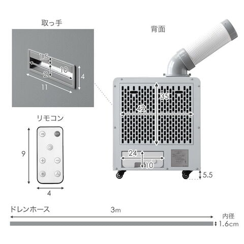 | 付属品 | ■リモコン ※電池はCR2025(3V)をご用意ください ■冷風ダクト用キット(一式) ■ドレンホース(内径16mm) ■取り扱い説明書(保証書付き) |