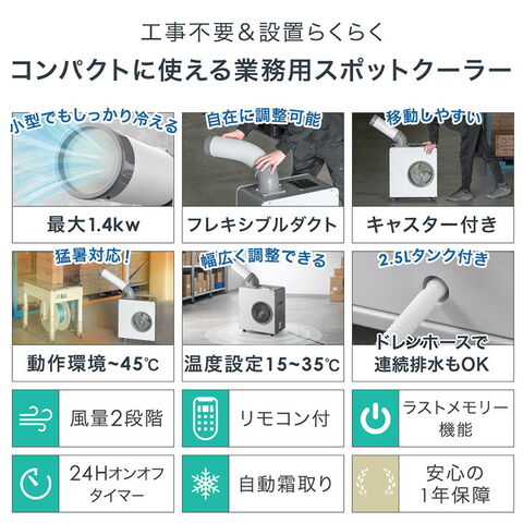 工事不要&設置らくらく コンパクトに使える業務用スポットクーラー ・コンパクトなのにしっかり冷える1.4kw ・自在に動く冷風ダクトで必要な場所をピンポイント冷却 ・移動しやすい取っ手/キャスター付き ・離れた場所からも操作できるリモコン付き ・風量は選べる2段階 ・15〜35℃の温度設定で現場に合わせて調整可能 ・猛暑対応!動作環境温度5~45℃ ・便利な24Hオンオフタイマー付き ・2.5Lタンク付き&ドレンホースでの連続排水もOK ・安心の1年保証付き |