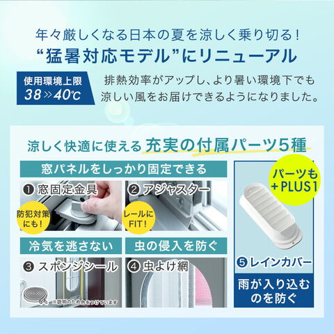 ※配送は全て宅配便(1人)での玄関渡しとなります。大型商品や重量商品、エレベーターの無い2階以上にお住まいのお客様は、玄関口までの搬入をお手伝いをお願いしております事をご了承ください。 ※商品ページの色味は、出来る限り実物に近い色で画像を掲載しておりますが、お使いのブラウザー及びモニターや使用環境により、実際の色と多少の差異があります。予めご了承ください。 ※お部屋全体の温度を下げる機能はありませんので、予めご了承いただきますようお願いいたします。 ※ご使用の前に、必ずアース線を端子へ接続してください。故障や漏電した場合、感電する恐れがあります。 ※窓パネルの取り付けの際にサッシとの間に隙間が生じる場合は、市販のエアコン用パテやスポンジテープを別途ご準備ください。 ※配送事故を防ぐため、商品の四角に透明なテープを貼っております。テープは剥がしてご使用ください。 ※少量の雨がダクトに侵入しても故障する恐れはございませんので、雨天時もご使用いただけます。暴風や豪雨などの悪天候の際には、窓パネル・本体の故障の恐れがありますのでご使用をお控えください。 ※2023年3月10日、窓パネルを4枚に増やしテラス窓にも設置ができるようになりました。 ※2024年2月29日、窓パネルの付属品(窓固定金具、スポンジシール、虫よけ網とアジャスター)を追加しました。 ※2025年2月14日、推奨使用環境の温度上限が40℃になり、室温が高い場所でも使える猛暑対応モデルに変更しました。併せて左右ルーバーを手動から自動に変更し、窓パネルの付属品にレインカバーを追加、摂氏→華氏への表示切り替えボタンを撤去しました。 ※2026年4月3日、付属品に断熱ダクトカバー、リモコンにスイングボタンが追加されました。(2026年モデル) |