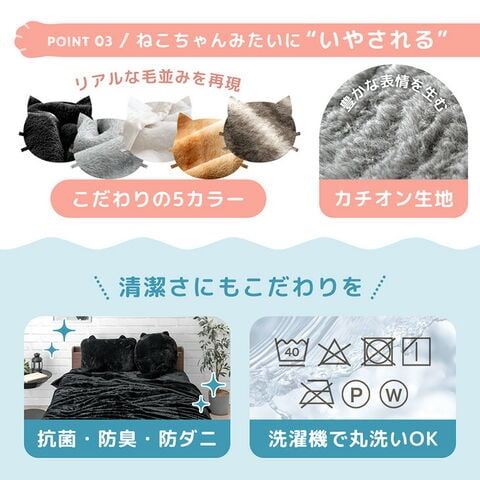 この冬いちばんのあったか&癒しアイテム 『もはや、ねこ。』二枚合わせ毛布 ・ねこの体温を再現 +3.8℃の温感シート ・ムレにくく暖かい吸湿発熱わた ・あたたかさを逃さない二枚合わせ ・湯たんぽを入れられるポケット×2付き ・高密度340g/m2のもふもふ生地 ・こだわり製法で実現した極上キャットタッチ ・ぱちっとしにくい静電気防止加工 ・本物の毛並みを再現するカチオン生地 ・安心の抗菌/防臭/防ダニ加工 ・洗濯機で洗えていつでも清潔 |