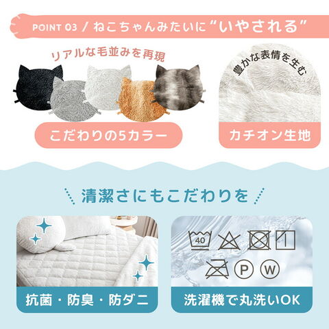 この冬いちばんのあったか&癒しアイテム 『もはや、ねこ。』敷パッド一体型ボックスシーツ ・ねこの体温を再現 +3.8℃の温感シート ・ムレにくく暖かい吸湿発熱わた ・見た目もあったか 側面も同じ生地を使用 ・湯たんぽを入れられるポケット×2付き ・高密度340g/m2のもふもふ生地 ・こだわり製法で実現した極上キャットタッチ ・ぱちっとしにくい静電気防止加工 ・本物の毛並みを再現するカチオン生地 ・安心の抗菌/防臭/防ダニ加工 ・洗濯機で洗えていつでも清潔 |