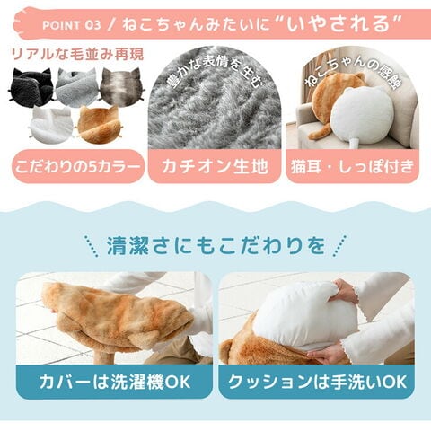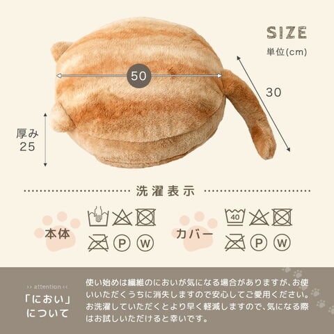 この冬いちばんのあったか&癒しアイテム 『もはや、ねこ。』クッション ・ねこの体温を再現 +3.8℃の温感シート ・高密度340g/m2のもふもふ生地 ・こだわり製法で実現した極上キャットタッチ ・ぱちっとしにくい静電気防止加工 ・本物の毛並みを再現するカチオン生地 ・中綿たっぷり600g ・丸洗いOK(カバー洗濯機、クッション手洗い) |