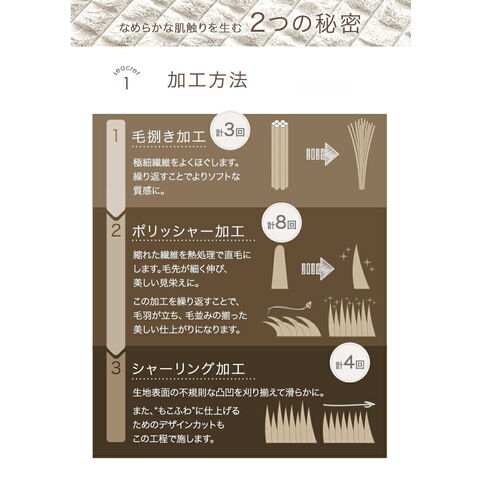 ・しっとり高保湿 椿オイル加工 ・ぱちぱちしない 静電気防止加工済み ・洗濯機で洗えていつでも清潔 |