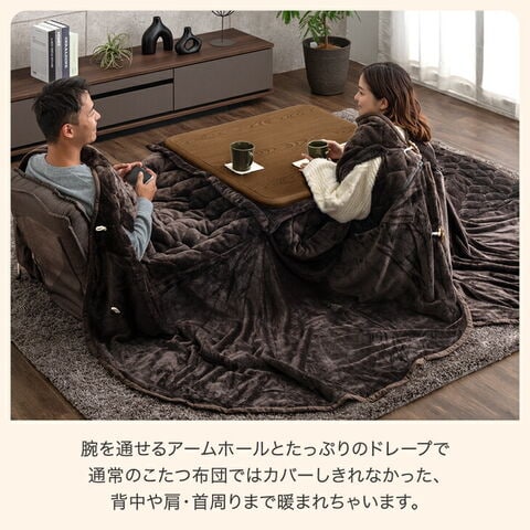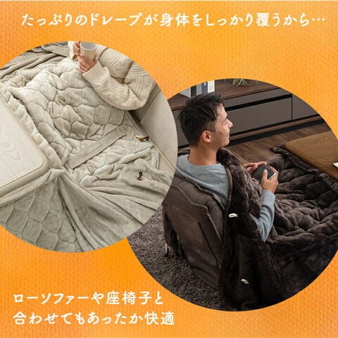 首や肩、背中まであたたかく使える 新提案“着るこたつ”掛け布団 ・空気が逃げず少ない電力であったか ・腕を通せるからデスクワークやスマホ時間にも! ・背中まであったか たっぷりドレープ ・“着るこたつ”ゾーン2面は付け替えOK ・付け替えはらくらくファスナー式 ・保温力UP!中綿入り ・中綿は優れた洗濯耐久性で洗ってもふんわり ・ふわさらフランネル生地 ・気になるニオイを抑制する 抗菌防臭 ・丸洗いOK!いつでも清潔 |