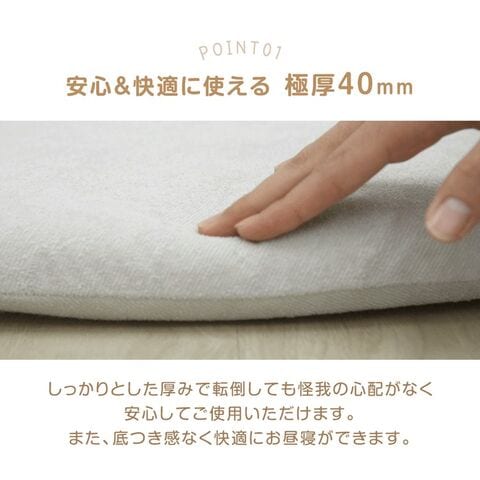 ・汚れても安心!全部洗える ・よだれなどの染み込みを防ぐ防水加工 ・転んでも安心 厚み4cm ・安心の低ホルムアルデヒド ・清潔キープ!抗菌・防臭・防ダニ加工 ・持ち運び&収納に便利 収納バッグ付 ・お子様の成長記録にピッタリ 円形デザイン ・床暖房対応 ・ズレを防止する滑り止め付き |