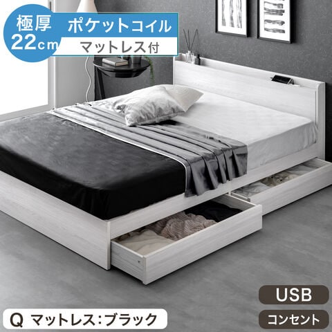 ベッド マットレス付き 収納付き クイーン すのこ ポケットコイルマットレス スマホスタンド USB コンセント付き マットレス付 引き出し付き ベッドフレーム 収納 マットレスセット 81200040 〔ベッド:ホワイトウォッシュ【マット:ブラック】〕