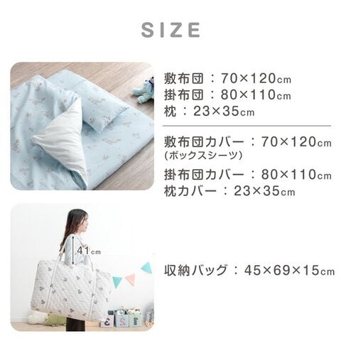 【サイズ】 敷布団カバー:80×110cm 掛布団カバー:80×110cm 枕カバー:23×35cm 【素材】 綿100% |