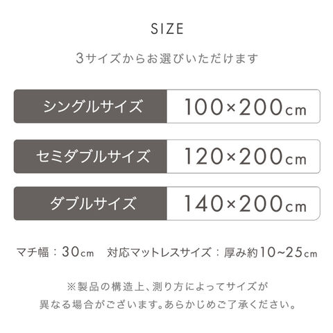 | サイズ | ・シングル :100×200cm ・セミダブル:120×200cm ・ダブル :140×200cm マチ幅:30cm ※厚み約10~25cmまでのマットレスに対応 |