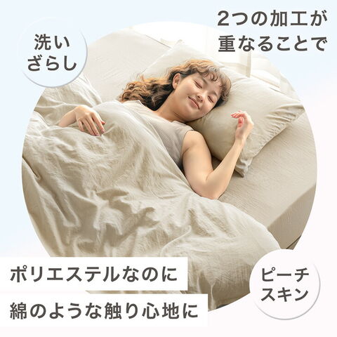 ・自然なシワ感を生む洗いざらし加工 ・なめらかな肌触りのピーチスキン加工 ・いつでも清潔!抗菌・防臭・防カビ・防ダニ加工 ・お子さまにも安心の低ホル ・取り付けらくらく&ずれにくい全周ゴム仕様 |