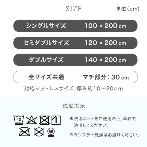 シングル:100×200cm セミダブル:120×200cm ダブル:140×200cm マチ部分:30cm ※厚み10~30cmのマットレスに対応 |