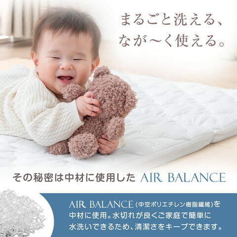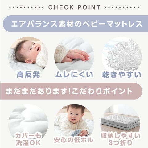 まるごと洗える&なが~く使えるエアバランスベビーマットレス ・お子様の成長をサポートする高反発 ・ムレにくい抜群の通気性 ・すぐに乾くからお手入れラクラク ・安心の低ホルムアルデヒド ・収納・持ち運びに便利な三つ折り仕様 |
