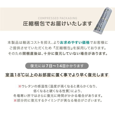 ※配送は全て宅配便(1人)での玄関渡しとなります。大型商品や重量商品、エレベーターの無い2階以上にお住まいのお客様は、玄関口までの搬入をお手伝いをお願いしております事をご了承ください。 ※商品ページの色味は、出来る限り実物に近い色で画像を掲載しておりますが、お使いのブラウザー及びモニターや使用環境により、実際の色と多少の差異があります。予めご了承ください。 ※本商品は圧縮梱包でお届けいたします。通常開封から1〜2日で復元しますが、気温や室温によっては3〜14日程かかる場合もございます。 ※復元時カバーのファスナーが破損するのを防ぐため、あらかじめ10cm程ファスナーを開けています。復元後は閉めてご使用ください。 |