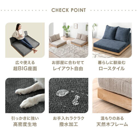 “座面の中”まで洗えるフロアソファ ・高機能素材AIR BALANCEを座面中材に使用 └優れた体圧分散性&通気性 └汚れても水洗いOK ・ゆったり使える超BIG座面 ・クッションはふっくらシリコンフィルを使用 ・くつろぎ方ひろがるアームレスデザイン ・暮らしに馴染むロースタイル ・引っかきに強い高密度生地 └お手入れラクラク撥水加工 ・座面がズレにくい固定テープ付き ・ぬくもり感じる天然木フレーム |