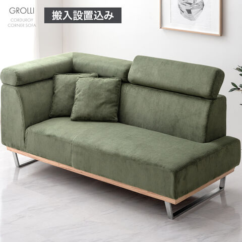 【搬入設置込み】コーデュロイ カウチソファ 2人掛け ヘッド リクライニング クッション 2個付き ソファ ソファー カウチソファー コーデュロイソファ 2P 2人掛 布地 モダン おしゃれ 99901229〔モスグリーン:右肘タイプ〕