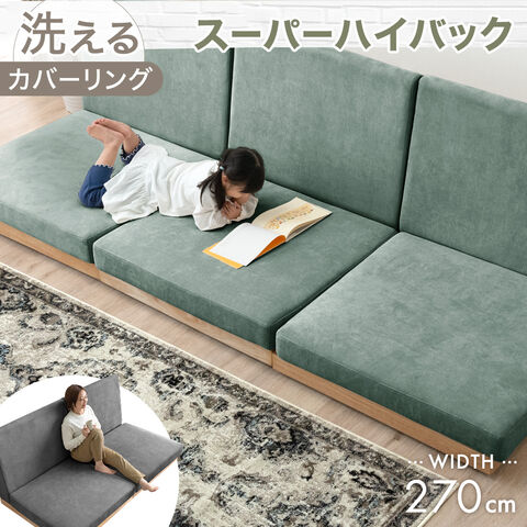 スーパーハイバック フロアソファ 洗える カバーリング 幅270cm 4人掛け ハイバック ソファ ソファベッド ローソファ ファブリック 木製フレーム 北欧 おしゃれ 82500110〔セージグリーン〕【予約】12月下旬※12/31までに出荷予定