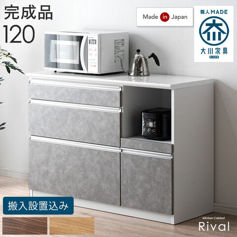 【搬入設置込み】キッチンカウンター 完成品 120 大型レンジ対応 日本製 大川家具 食器棚 収納 木目 間仕切り キッチン収納 レンジ台 キッチンラック 対面式 幅120 120cm ロータイプ おしゃれ 【超大型】 99901218〔ストーングレー〕
