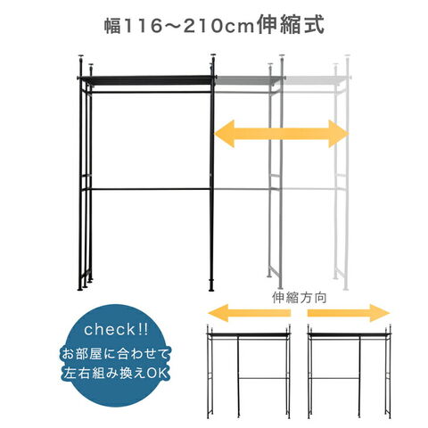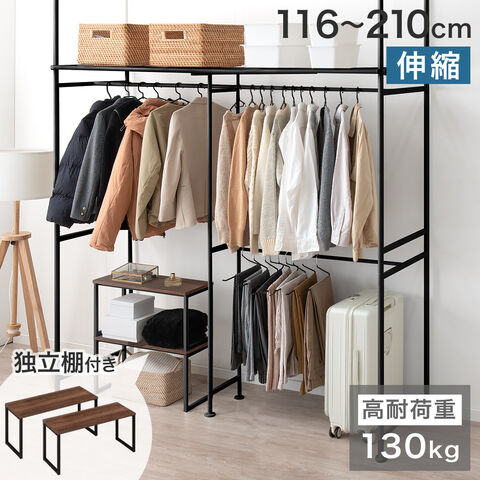 【即納】 突っ張り ハンガーラック 伸縮 幅116 - 210cm 上棚付き 独立棚 2段 大容量 頑丈 収納 吊り下げ収納 衣類収納 壁面 クローゼット コートハンガー ワードローブ ワイド ラック 棚 84300027〔ブラック〕