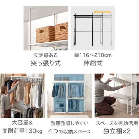 ・安定感ある突っ張り式 ・洋服の量に合わせて伸縮OK ・整理整頓しやすい4つの収納スペース ・スペースを有効活用 独立ラック×2 |