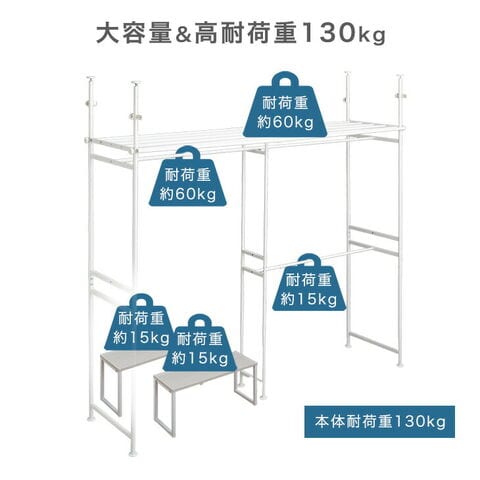 | 耐荷重 | 本体:約130kg 上棚:約60kg 上段ポール:約60kg 下段ポール:約15kg 独立棚:約15kg |