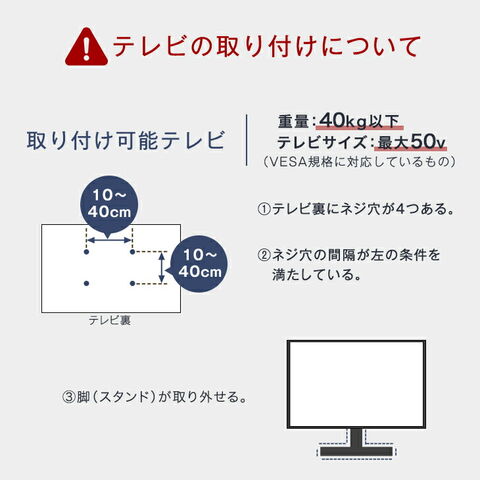 テレビ取付部:約40kg以下(50インチテレビ以下 VESA規格対応) |