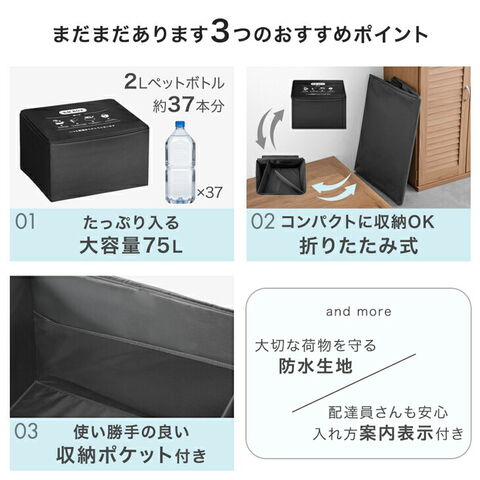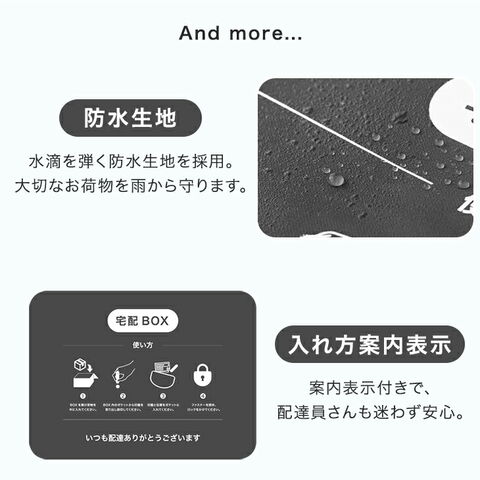 ・内部には印鑑や伝票を収納出来るポケット付き ・雨から荷物を守る 撥水加工 ・配達員さんも安心! 荷物の入れ方案内表示 ・防犯対策に 南京錠&防犯ワイヤー付き |
