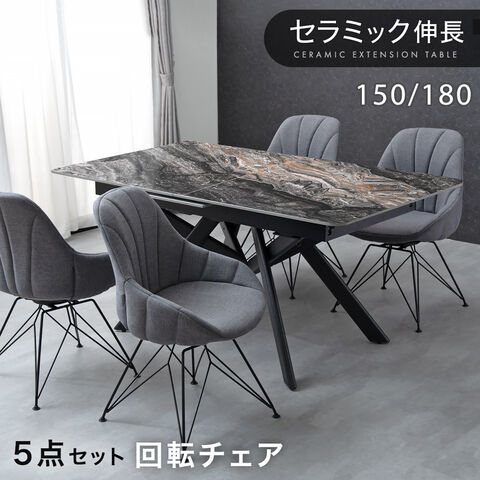 セラミック 伸長式 ダイニングセット 5点 4人掛け 回転椅子 伸縮 伸長 鏡面 150 180 折りたたみ ダイニング テーブル ダイニングチェア 玄関渡し【超大型】 99901135〔ジャスパーブラック【チェア:グレー】〕