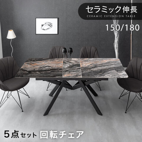 セラミック 伸長式 ダイニングセット 5点 4人掛け 回転椅子 伸縮 伸長 鏡面 150 180 折りたたみ ダイニング テーブル ダイニングチェア 玄関渡し【超大型】 99901135〔ジャスパーブラック【チェア:ダークブラウン】〕