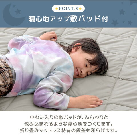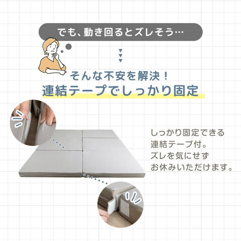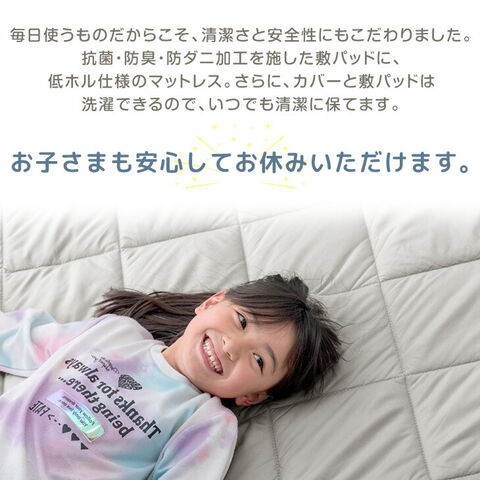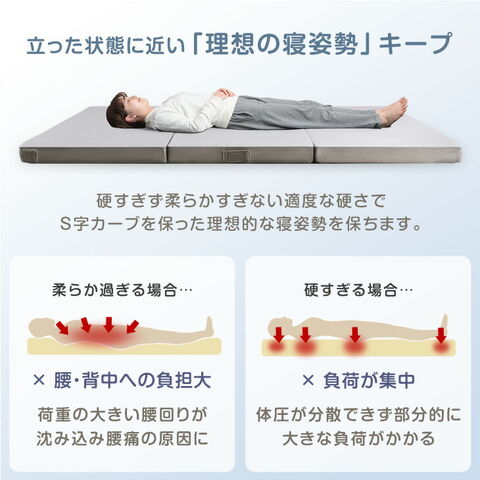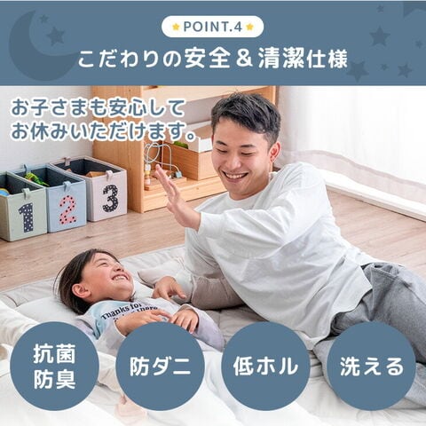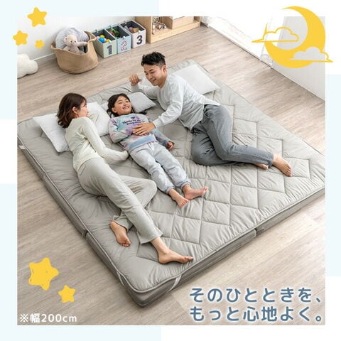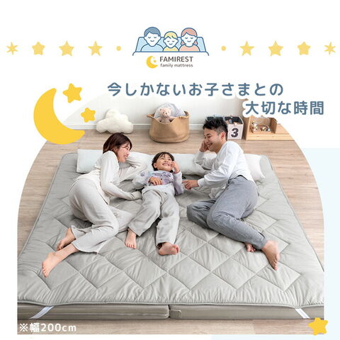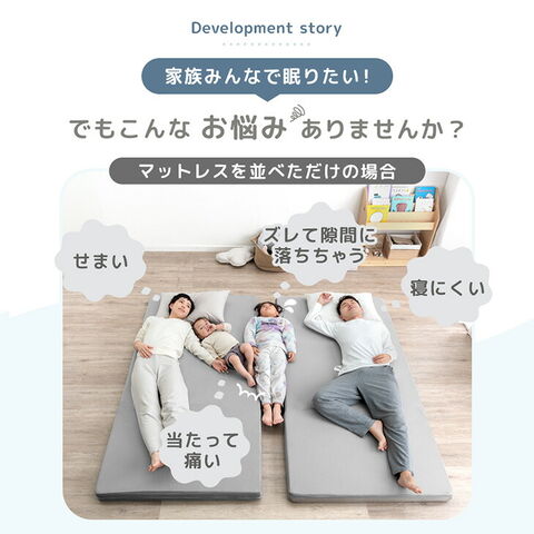 家族みんなでひろびろ寝れるファミリーマットレス ・腰をやさしく支える高反発ウレタン ・敷パッドには清潔に使える抗菌/防臭/防カビ生地を採用 ・安心の低ホルムアルデヒド ・敷パッドとカバーはご家庭で丸洗いOK! ・通気性に優れたサイドメッシュ ・ライフスタイルに合わせて分割可能 ・収納やお手入れに便利な3つ折りタイプ |