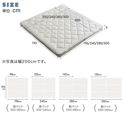 【幅200cm】 マットレス:97×195cm(シングル)×2枚 敷パッド:200×200cm 【幅240cm】 マットレス:120×195cm(セミダブル)×2枚 敷パッド:200×240cm 【幅280cm】 マットレス:140×195cm(ダブル)×2枚 敷パッド:200×280cm 【幅300cm】 マットレス:150×195cm(ダブル)×2枚 敷パッド:300×280cm |
