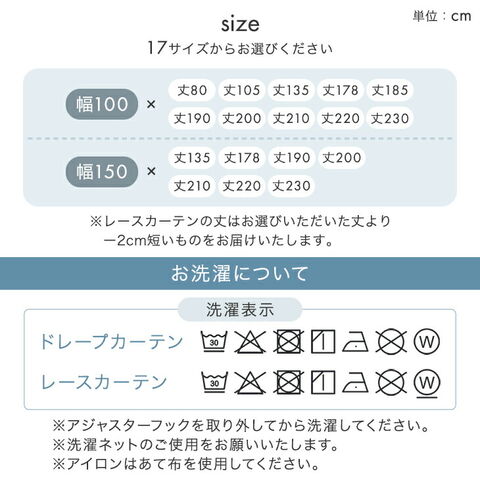 幅100×丈105cm、幅100×丈135cm、幅100×丈178cm、幅100×丈185cm、幅100×丈200cm 幅150×丈135cm、幅150×丈178cm、幅150×丈200cm ※丈はドレープカーテンのサイズとなります。レースカーテンの丈はドレープカーテンの-2cmとなります。 ※付属のアジャスターフックはAフック(調整幅:-4cm~+1cm) |