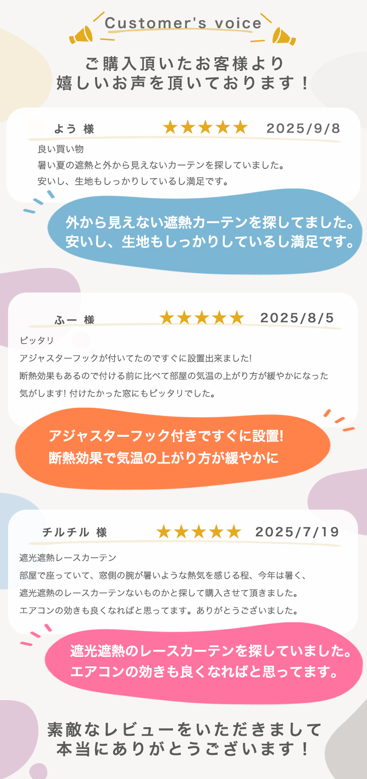 ・高い断熱効果で節電対策にも ・人/家の日焼けを防ぐUVカット加工 ・窓に合わせて選べる8サイズ ・アジャスターフックで丈の微調整OK ・洗濯機で丸洗い可能 ・お洗濯しても美しいヒダをキープする形状記憶 |