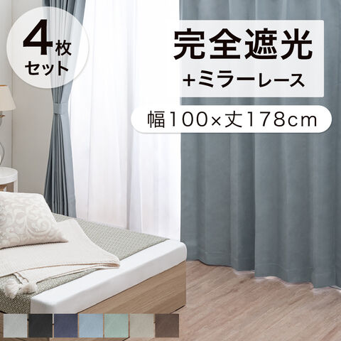 【即納】 完全遮光 カーテン 4枚セット 幅100cm 丈178cm 遮光カーテン 1級 遮光 洗濯 可 レースカーテン ミラーレース レース 透けない アジャスター フック タッセル 既成 ドレープカーテン UVカット 断熱 遮熱 86500029〔スモークブルー〕