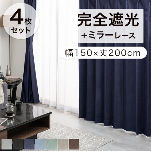 【即納】 完全遮光 カーテン 4枚セット 幅150cm 丈200cm 遮光カーテン 1級 遮光 洗濯 可 レースカーテン ミラーレース レース 透けない アジャスター フック タッセル 既成 ドレープカーテン UVカット 断熱 遮熱 86500034〔ネイビーアッシュ〕