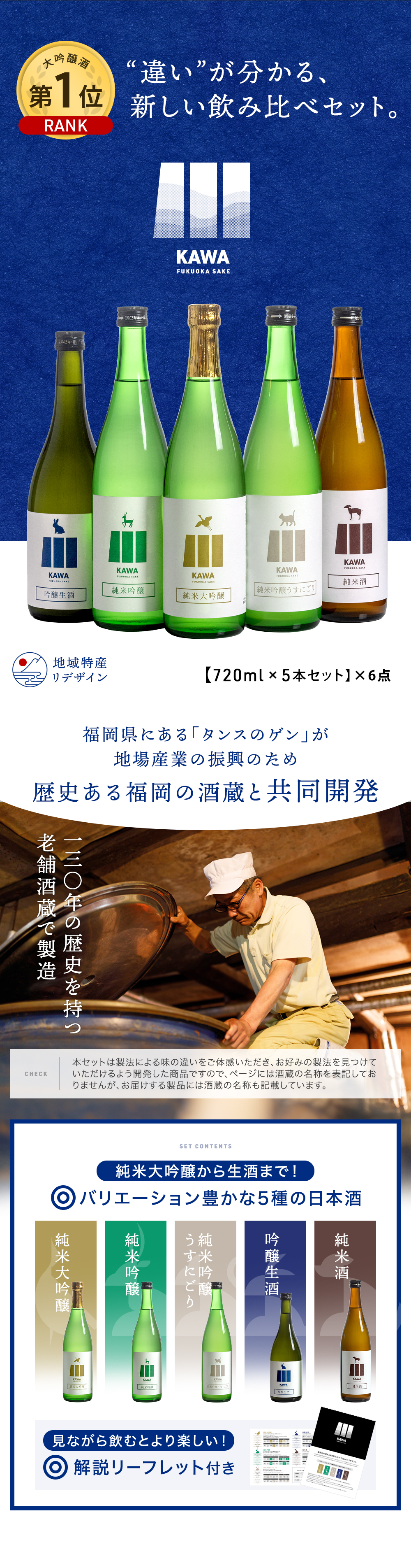 歴史ある福岡の酒蔵と共同開発 “違い”が分かる! 福岡日本酒飲み比べセットKAWA ・「地域特産リデザイン」対象商品 ・酒蔵ではなく製法で選ぶ、飲み比べセット。 ・製法や詳細が分かるリーフレット付き ・味の違いにこだわった5種のラインナップ ・好みの味が見つかる ・お酒選びの基準が分かる ・初心者にも上級者にもおすすめ ・贈り物にもぴったり ・5本とも同じ酒蔵で製造。 ・130年の歴史を持つ福岡の老舗酒蔵製 ※「地域特産リデザイン」は、九州・福岡県で活動するタンスのゲンの地域貢献型の製品開発の取り組みです。地域特産品をインターネットで販売するためにリデザインすることで地域と日本・世界をつなぐことができるとタンスのゲンでは考えています。今後も家具にとどまらず、九州の地域特産品を全国・世界に届けるような取り組みを行っていきます。 |
