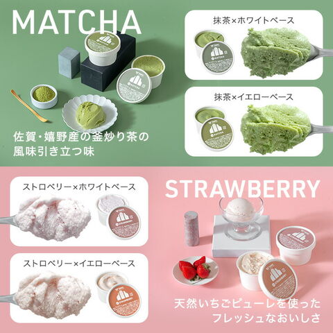| 抹茶(イエローベース) | 無脂乳固形分:7.0% 乳脂肪分:8.0% 卵脂肪分:0.7% 原材料名:生乳(佐賀県産)、生クリーム、グラニュー糖、脱脂防乳、ブドウ糖、卵黄、抹茶(佐賀県産)/乳化剤(一部に乳成分・卵を含む) |