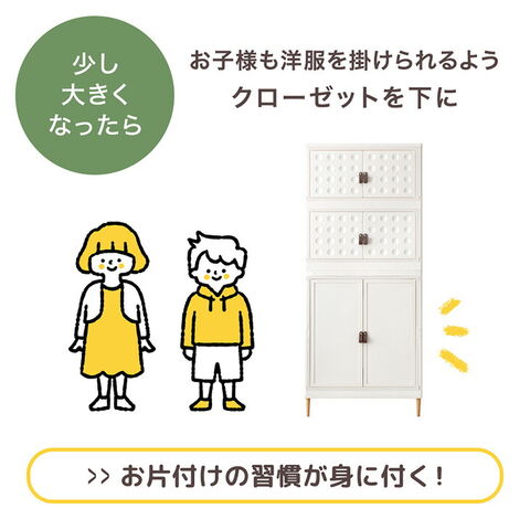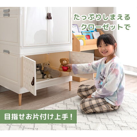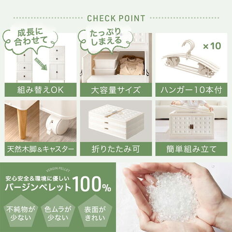 ・成長に合わせて組み替えOK! ・たっぷりしまえる大容量収納 ・かわいいキッズハンガー×10個SET ・大きくなっても使えるシンプルデザイン ・脚部はお好みに合わせて付け替え可 …お掃除ロボ対応 天然木脚 …移動らくらく キャスター ・高品質&環境にやさしいバージンペレット100% ・安心のノンホルムアルデヒド ・工具不要!かんたん組み立て ・使わない時はコンパクトに折り畳める |