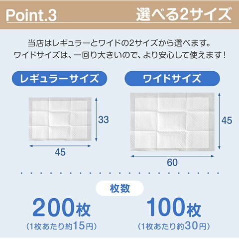 | サイズ | [レギュラー] 33x45cm(吸収体サイズ:27×39cm) [ワイド] 45x60cm(吸収体サイズ:39×53cm) |