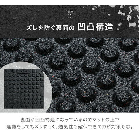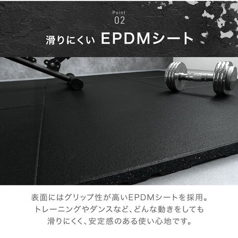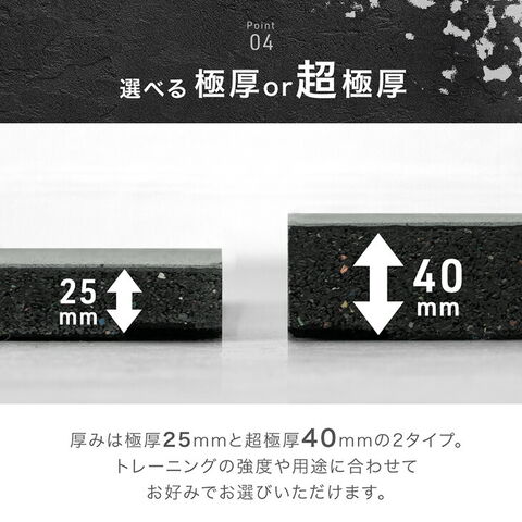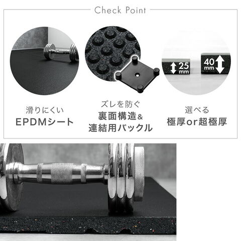 ・トレーニングマシンも安心して置ける硬度65 ・耐水性、耐久性に優れたEPDMシート ・汗で汚れても一拭きでお手入れ簡単 ・ズレを防ぐ連結パーツ付き ・用途に合わせて選べる厚み2タイプ |