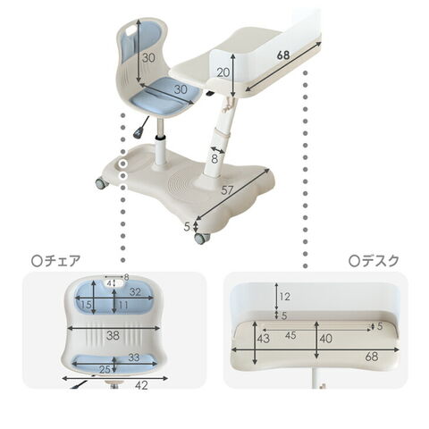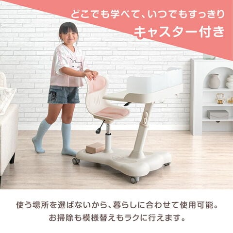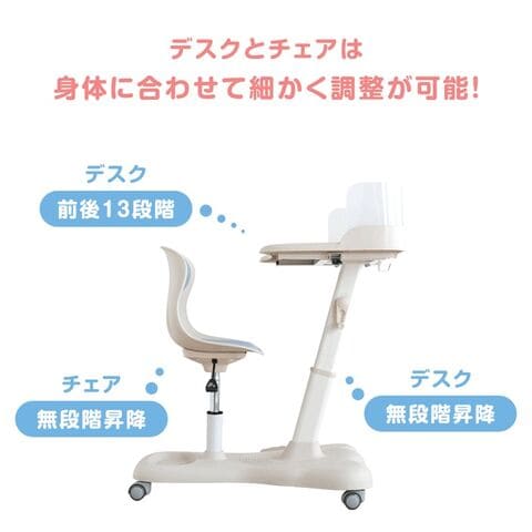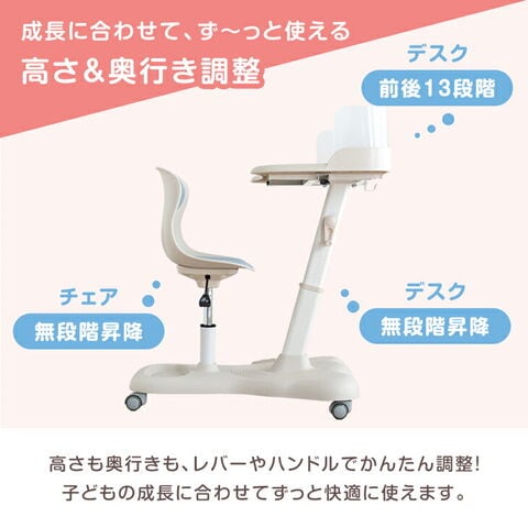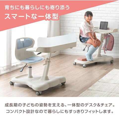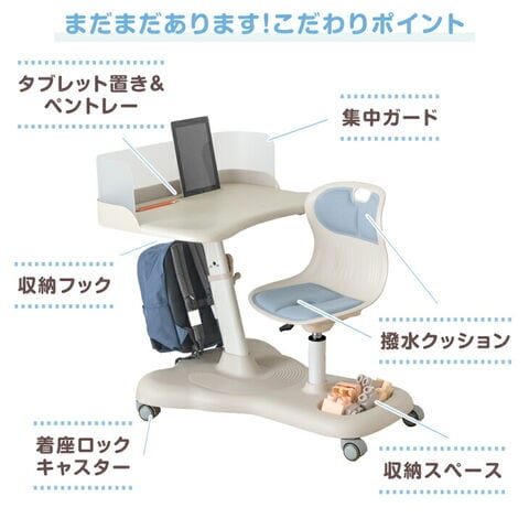 ・育ちにも暮らしにも寄り添うデスク・チェア一体型 ・成長に合わせてず~っとフィット …チェア無段階昇降(レバー式) …デスク無段階昇降(ハンドル式) …デスク前後13段階ワンタッチ調整(レバー式) ・どこでも学べて、いつでもすっきりキャスター付 …勉強に集中しやすい着座ロックキャスター ・通信学習に便利 タブレットスタンド ・座面/背もたれクッションは撥水でお手入れラクラク ・安心の角丸デザイン |