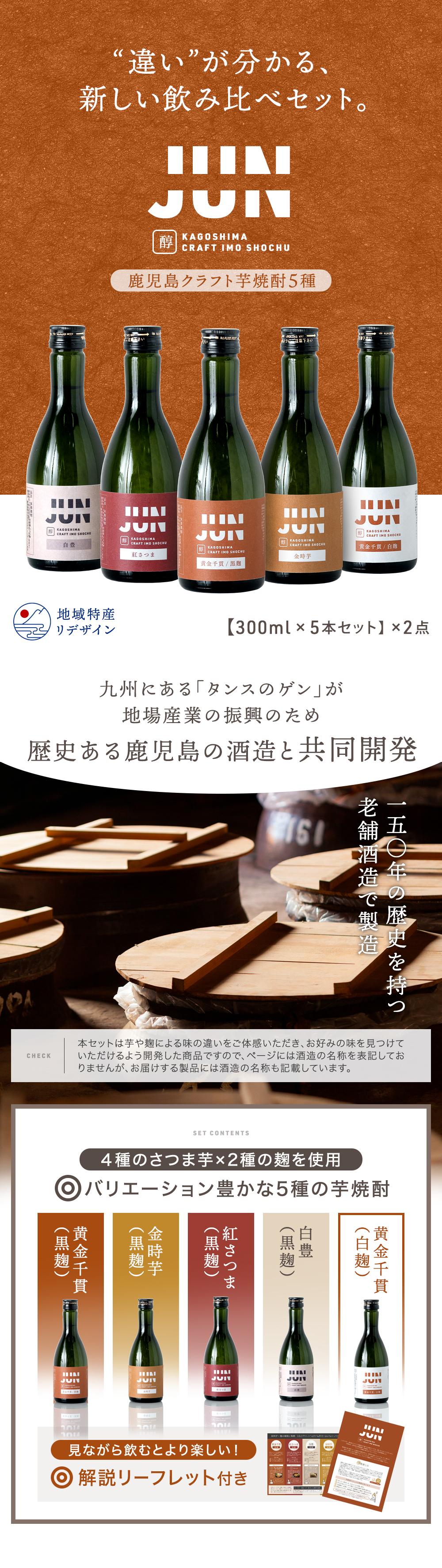 九州にある「タンスのゲン」が地場産業の振興のため、 歴史ある鹿児島の酒造と共同開発! “違い”が分かる! 鹿児島芋焼酎飲み比べセット JUN-ICHI ・「地域特産リデザイン」対象商品 ・酒蔵ではなく“芋”と“麹”で選ぶ飲み比べセット ・製法や詳細が分かるリーフレット付き ・味の違いにこだわった5種のラインナップ ・好みの味が見つかる ・お酒選びの基準が分かる ・初心者にも上級者にもおすすめ ・贈り物にもぴったり ・5本とも同じ酒蔵で製造。 ・150年の歴史を持つ鹿児島の老舗酒造製 ※「地域特産リデザイン」は、九州・福岡県で活動するタンスのゲンの地域貢献型の製品開発の取り組みです。地域特産品をインターネットで販売するためにリデザインすることで地域と日本・世界をつなぐことができるとタンスのゲンでは考えています。今後も家具にとどまらず、九州の地域特産品を全国・世界に届けるような取り組みを行っていきます。 |