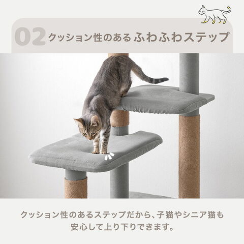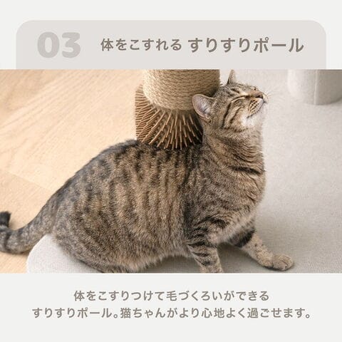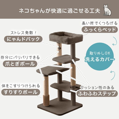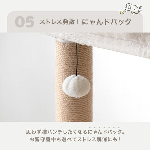 ・洗えるカバーリングでいつでも清潔 ・簡単に設置できる据え置きタイプ ・クッション性のある ふわふわステップ ・存分にバリバリできる 爪とぎポール ・体をこすれる すりすりポール ・ストレス発散! にゃんドバック |