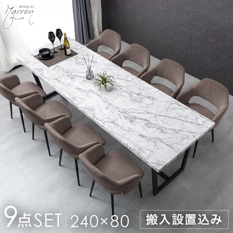 【テーブル搬入設置込】幅240cm 石目調 ダイニングセット 8人掛け 9点 長方形 テーブル チェア 大人数【超大型】99900036〔テーブル:マーブルホワイト/チェア:ショコラブラウン(ファブリック)〕