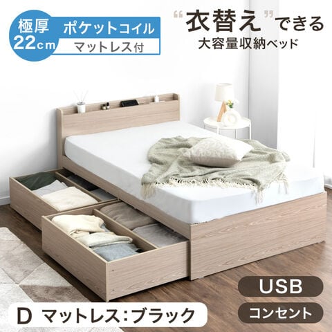 大容量収納ベッド マットレス付き ダブル 大容量 2コンセント ポケットコイルマットレス 宮棚 収納ベッド マットレスセット ベッド マットレスセット 収納付きベッド 収納 99900062〔ナチュラル【マット:ブラック】〕