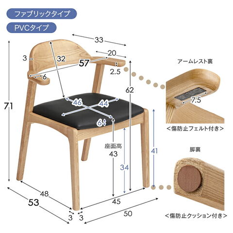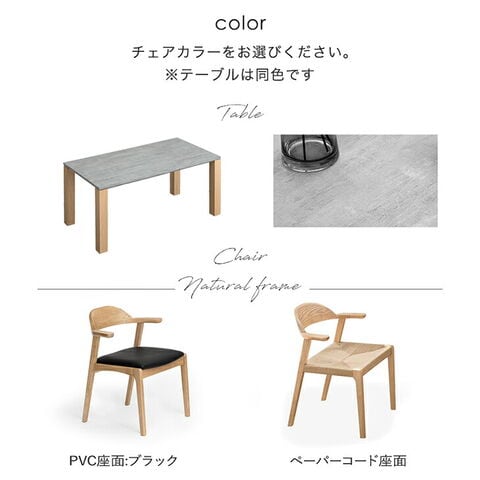 | 素材 | 【テーブル】 天板:メラミン化粧繊維板 [ウレタン塗装] 脚:強化紙化粧繊維板 【チェア】 【PVC座面タイプ】 フレーム:アッシュ無垢材(ラッカー塗装) 張地:PVCレザー 中材:ウレタン(30D) 【ファブリック座面タイプ】 フレーム:アッシュ無垢材(ラッカー塗装) 張地:ファブリック (ポリエステル100% 撥水加工済) 中材:ウレタン(30D) 【ペーパーコード座面タイプ】 フレーム:アッシュ無垢材(ラッカー塗装) 張地:ペーパーコード |
