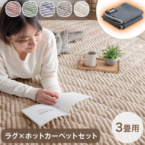 ラグ+ホットカーペット2点セット 3畳用 ホットカーペットセット 防菌 防臭 防ダニ 軽量 ラグ 床暖房カーペット 電気マット 正方形 オールシーズン 絨毯 ストライプ フランネル 99900119〔ミルクティーベージュ〕【予約】12月下旬※12/31までに出荷予定